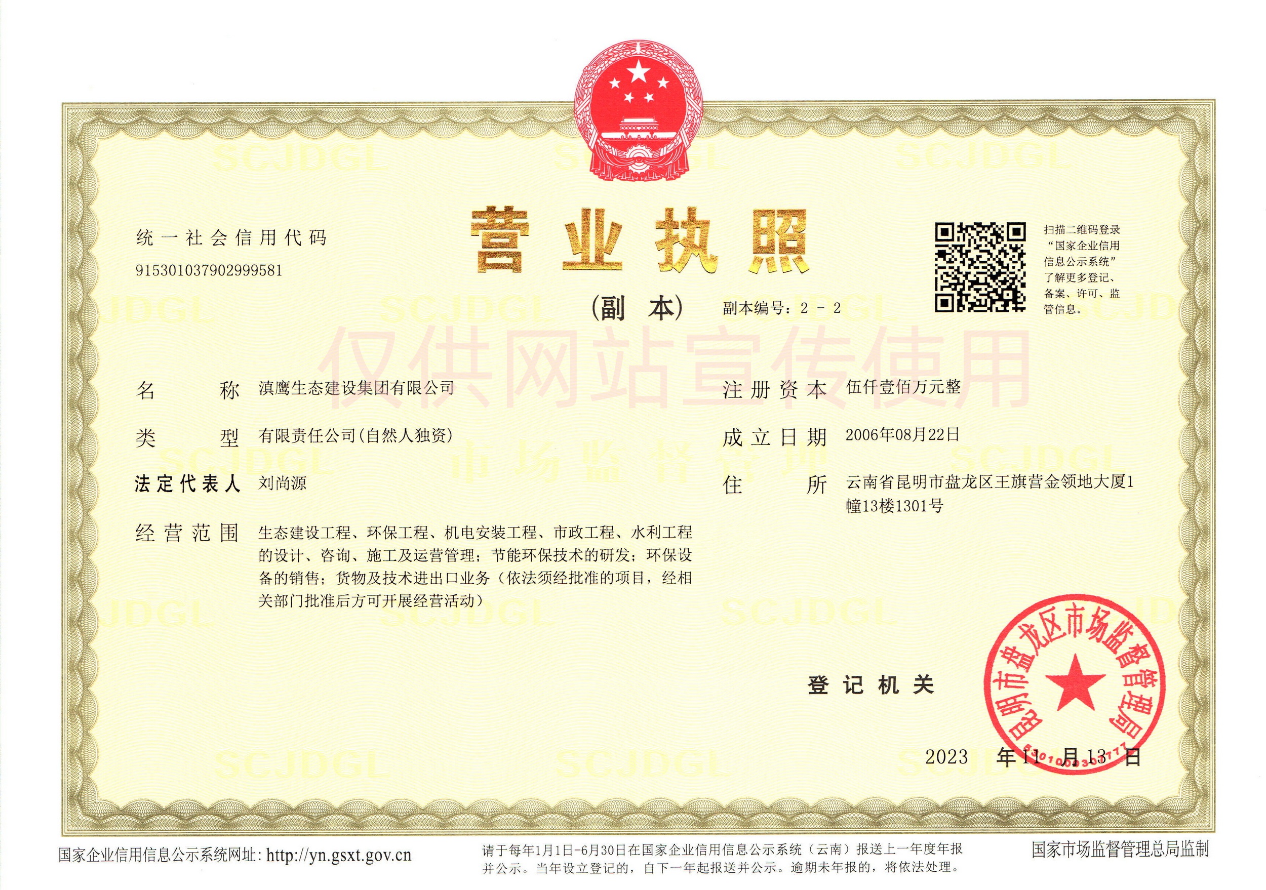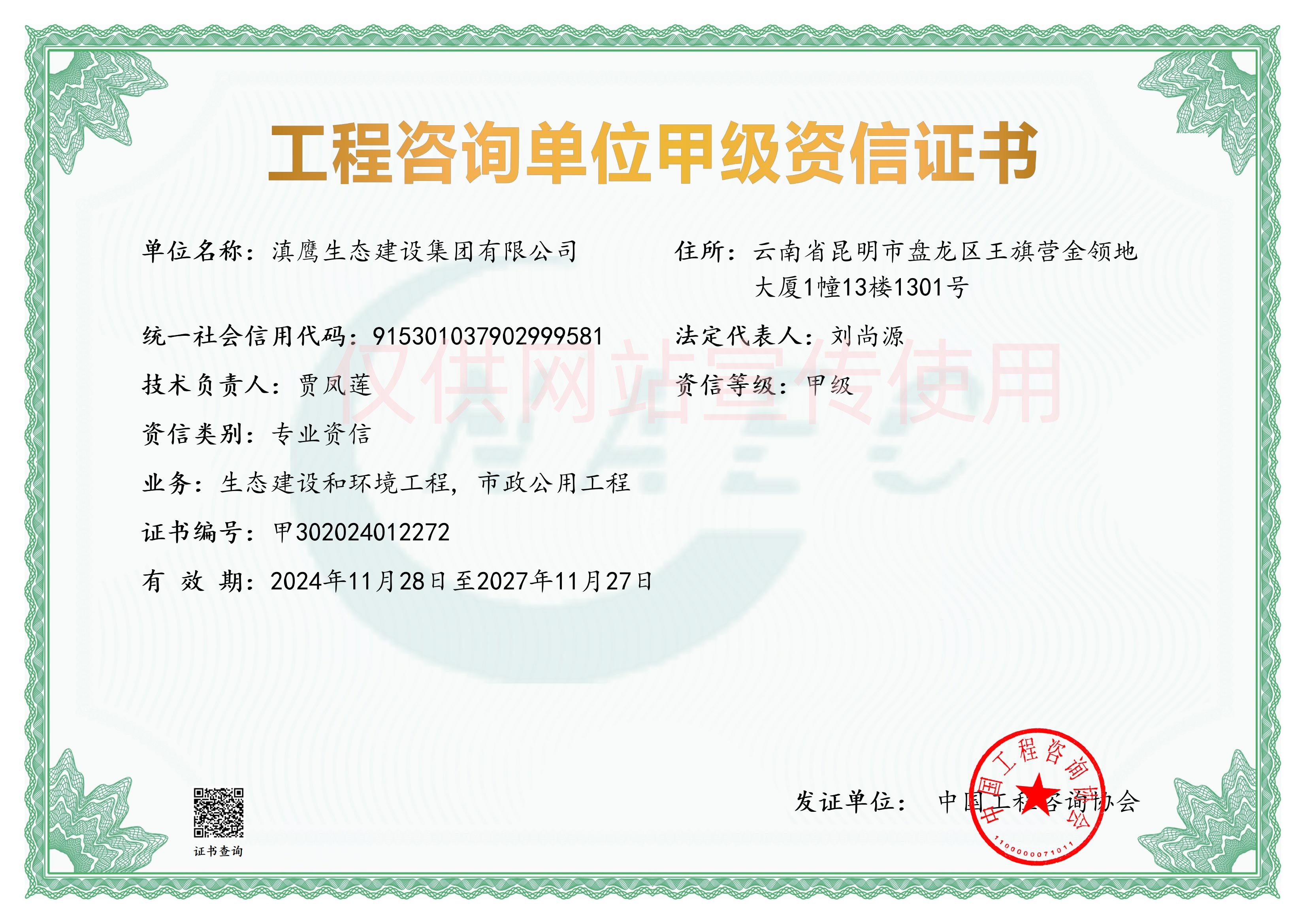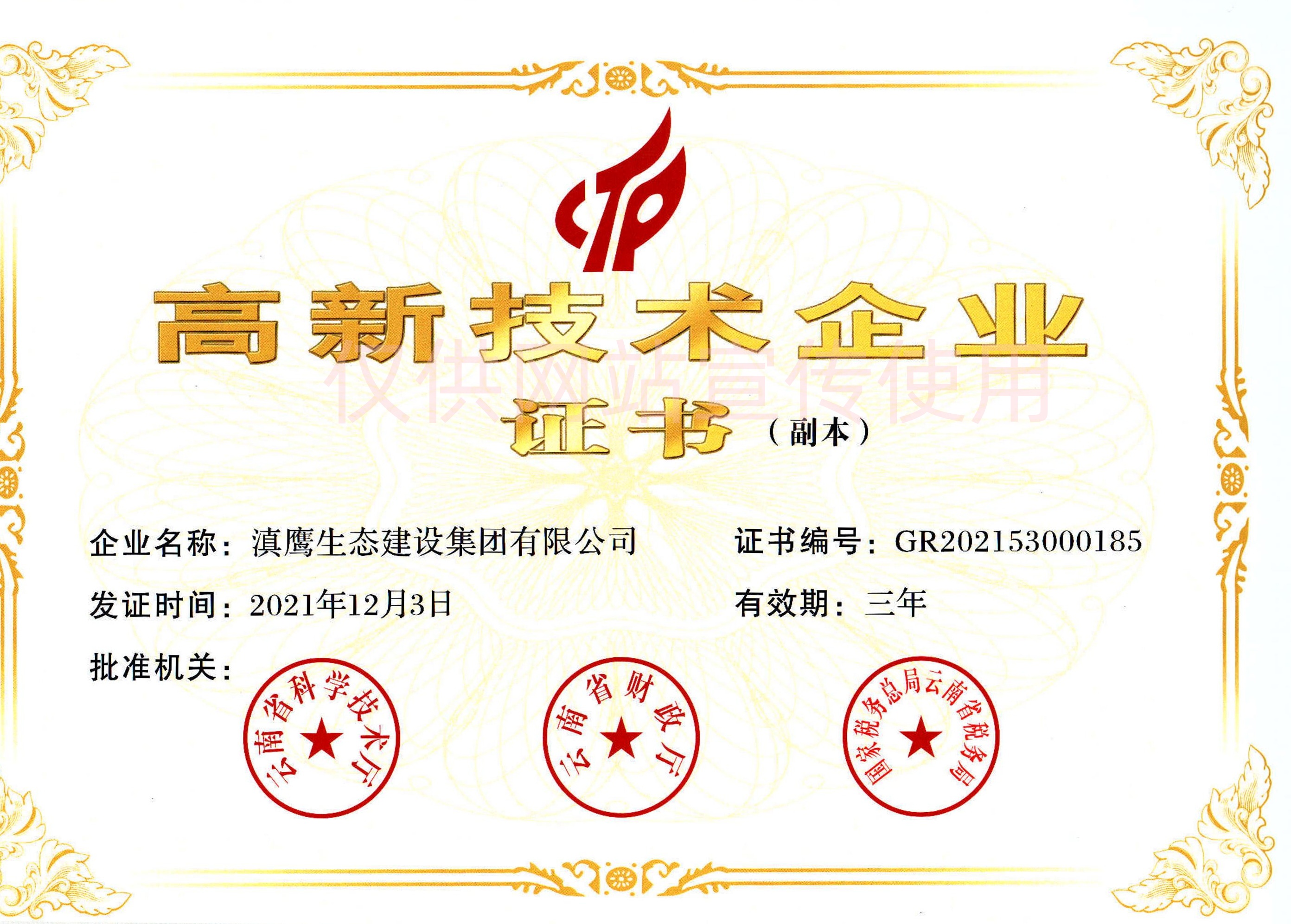 滇鹰生态建设集团以雄厚的技术力量、先进的经营理念,浓厚的企业文化,不懈的创新精神,迅速发展成为生态环保行业中最具影响力的企业之一。集团具有工程咨询资质甲级、环境工程设计资质、市政行业工程设计资质、环保工程专业承包壹级资质、市政公用工程施工总承包贰级资质、环境污染治理甲级资质、污染治理设施运营资质等,并荣获“国家高新技术企业、国家级科技型中小企业、云南省“专精特新”中小企业”、昆明市企业技术中心、云南省挂牌企业等荣誉称号。