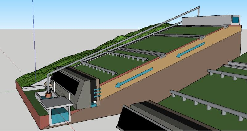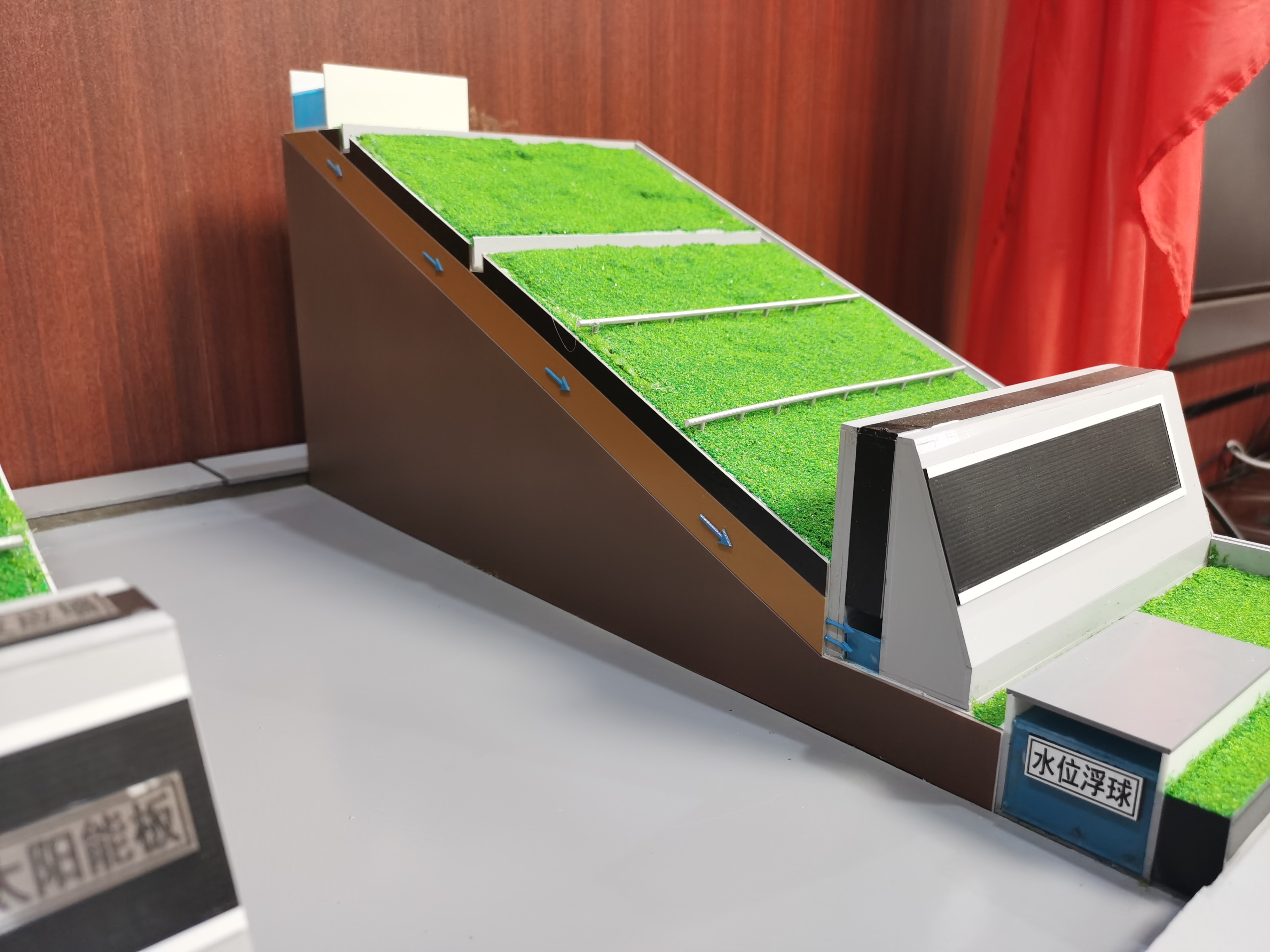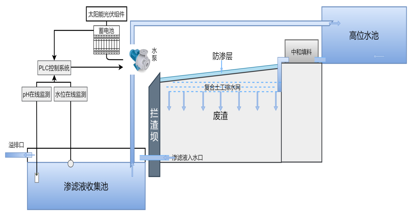 该技术工艺是采用PLC 控制系统配备水位传感器及水质量传感器(如pH及重金属),通过信号可以控制水泵启动和停止,并采用光伏发电系统作为动能输出。未达排放标准的渗滤液水位达到一定条件后,通过pH传感器及水位传感器输出的信号控制水泵的启动,将渗滤液提升至高位水池内,渗滤液通过重力自流经过中和填料池进行反应,反应后的渗滤液通过铺筑于上部的复合土工排水网均匀下渗至废渣内再次进行反应,以起到固定污染物的目的。如此循环,最终达到渗滤液达标排放的目标。